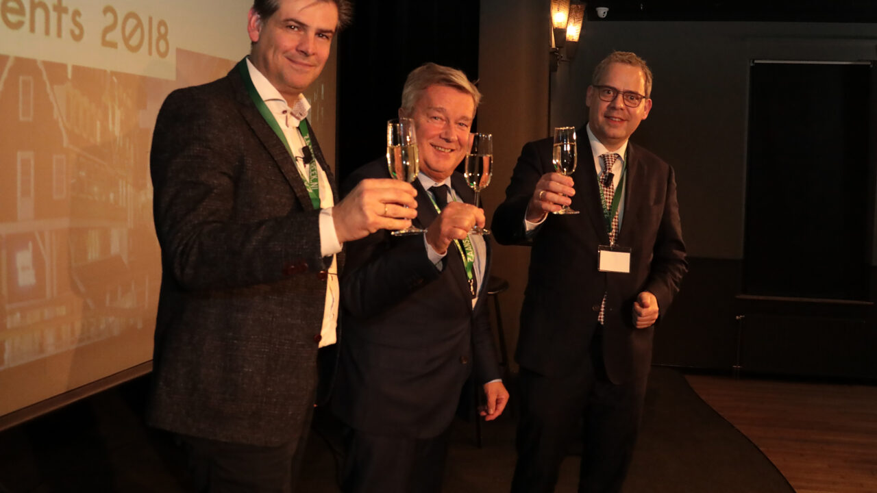 21 november 2017: Presentatie Marketing Zaanstreek 2018. Proosten op de samenwerking tussen SMZ en gemeente Zaanstad. Vlnr: Lex Kruijver, Paul Luijten (beiden SMZ) en wethouder Dennis Straat (gemeente Zaanstad).